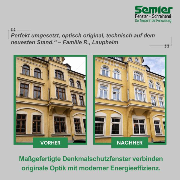 Denkmalschutz erfordert Präzision und ein Gespür für Details Bei diesem Projekt wurden die Fenster originalgetreu nach historischem Vorbild gefertigt und gleichzeitig technisch auf den neuesten Stand gebracht. So bleibt die charakteristische Optik vollständig erhalten, während Funktionalität und Energieeffizienz deutlich verbessert werden. Ein Ergebnis, das Tradition sichtbar bewahrt und gleichzeitig moderne Anforderungen zuverlässig erfüllt. „Perfekt umgesetzt – optisch original, technisch auf dem neuesten Stand.“ – Familie R., Laupheim